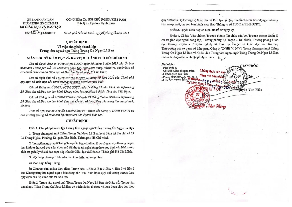 Quyết định thành lập Trung tâm ngoại ngữ tiếng Trung Ôn Ngọc Là Bạn của Sở GD&ĐT